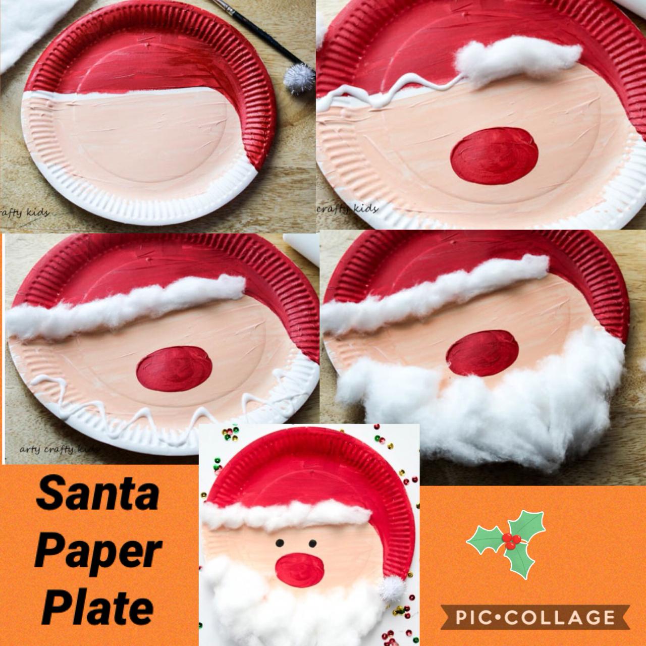 • Description : Paint half of the paper plate a skin tone ( by mixing white with a small amount of orange or pink ) and the other half a vibrant red , with a curve around the edge of the paper plate to create a "hat" shape. Add a big red nose using red paint. Between the border of the skin colored paint and red, add plenty of glue. Now separate and thin out the cotton wool and spread along the trail of glue, leaving some space to create the appearance of a hanging Santa Hat. Add some glue to the bottom of the paper plate . Add more cotton wool and this time fluff it up a little to create a nice fluffy beard . Finish off by adding a pair of eyes using black paint and a white pom pom at the tip of the hat. Your super cute , super adorable paper plate Santa is now ready !
