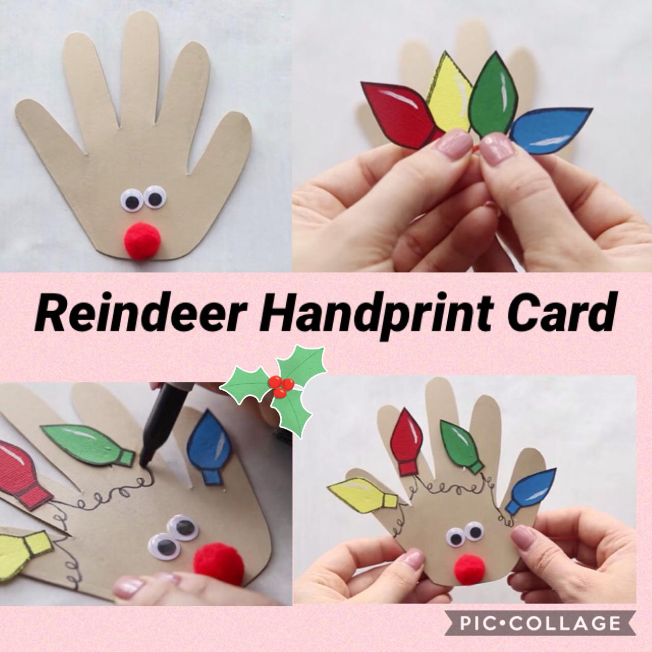 • Description : Fold a piece of Brown chart paper in half . Trace your hand print so that the folded part is as the pinky finger. Glue on two googly eyes and a red pom pom nose. Draw a light bulb shape on Blue chart paper and use that to trace 3 more light bulbs on Yellow , Red and Green chart paper. Using a marker, trace around the light bulb and then add a small white line on the right with white paint . Glue on the light bulbs and then use a marker to draw the other light strings. Write a Christmas message inside your card. Your Reindeer Hand Print Card is now ready !