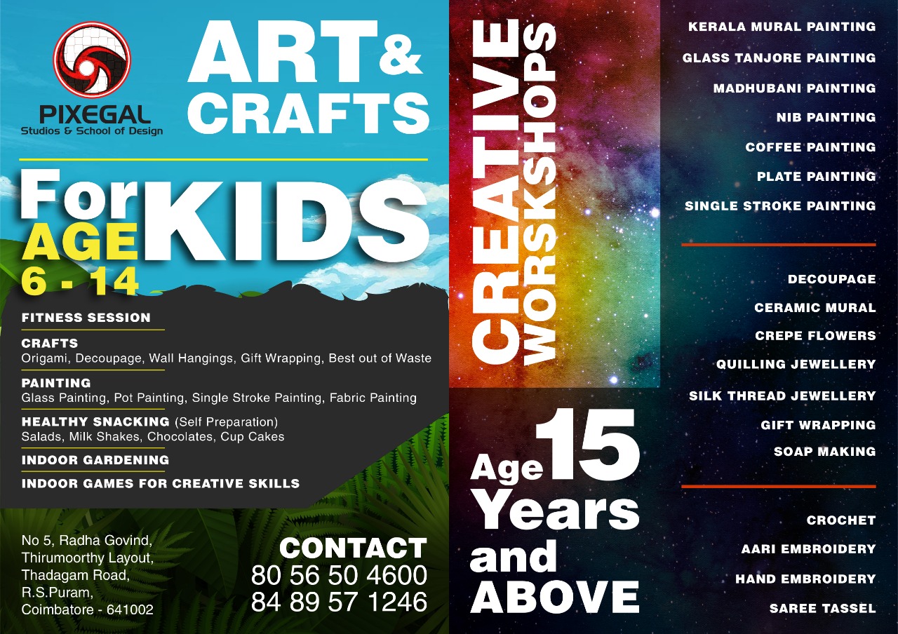 Crafts : Origami, Decoupage,Wall Hangings, Gift Wrapping, Best out of WastePainting : Glass Painting, Pot Painting, Single Stroke Painting, Fabric PaintingHealthy Snacking : Salads, Milk Shakes, Chocolates, Cup Cakes Indoor GardeningIndoor Games for creative skills