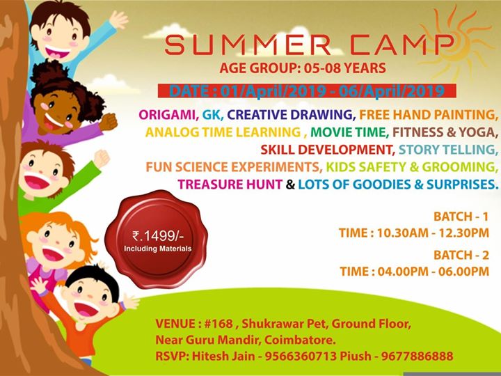 OrigamiGKCreative DrawingFree Hand PaintingAnalog Time LearningMovie TimeFitness & YogaSkill DevelopmentStory TellingFun Science ExperimentsKids Safety & GroomingTreasure HuntLots of Goodies & SurprisesBatch 1 : 10.30am - 12.30pmBatch 2 : 4pm - 6pmVenue : #168, Shukrawar Pet, Ground Floor, Near Guru Mandir, Coimbatore