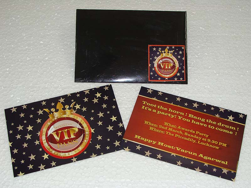 Rectangular invites with single side printing. They come with a white coloured envelope with a theme based sticker on it.