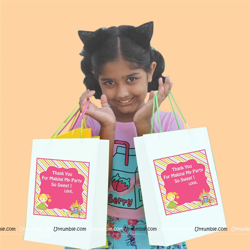 Customized return gift bag based on the theme. White bag with a theme based customized sticker on the front side.