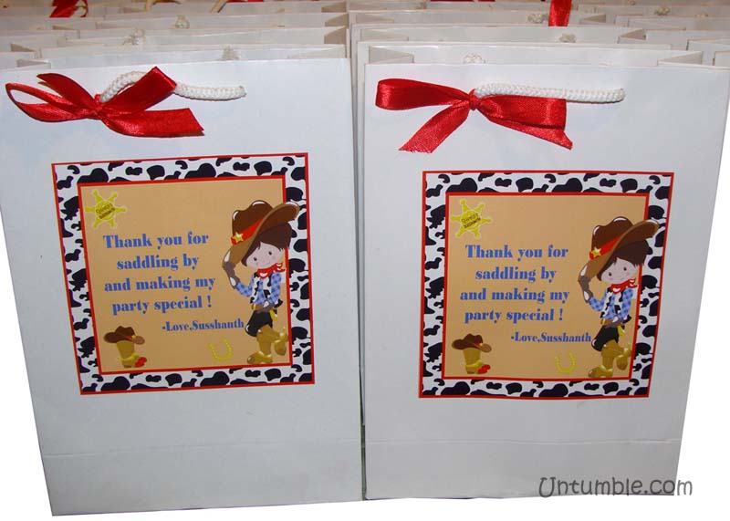 Customized return gift bag based on the theme. White bag with a theme based customized sticker on the front side.