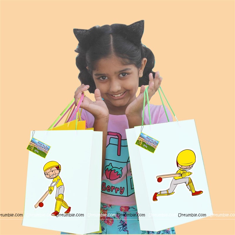Customized return gift bag based on the theme. White bag with a theme based customized sticker on the front side.