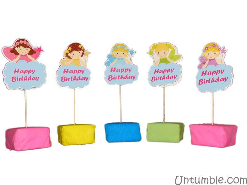 Several different options to pick from - 1. Skewers with toppers poked on a thermocol base or cup cakes2. Sided artboard centerpiece