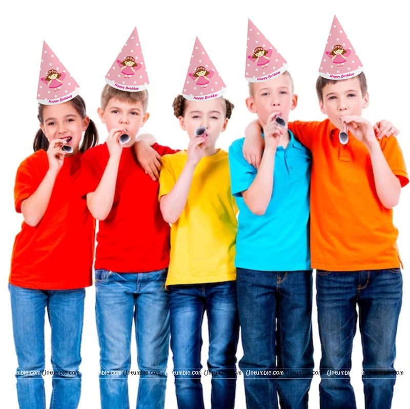 A party is incomplete without hats. These fully customized hats are printed to the theme and can incorporate a name and a snippet of text.