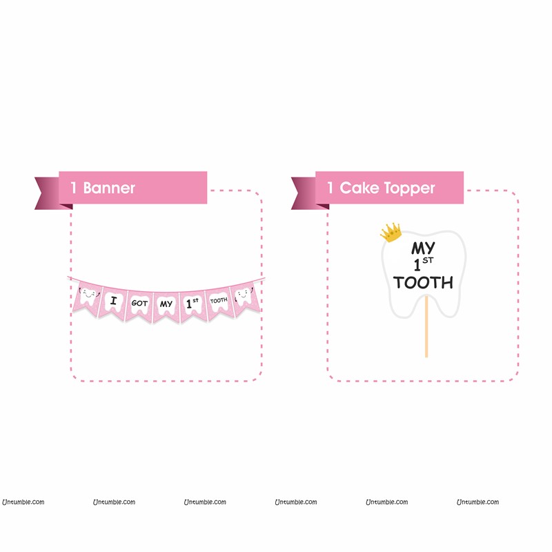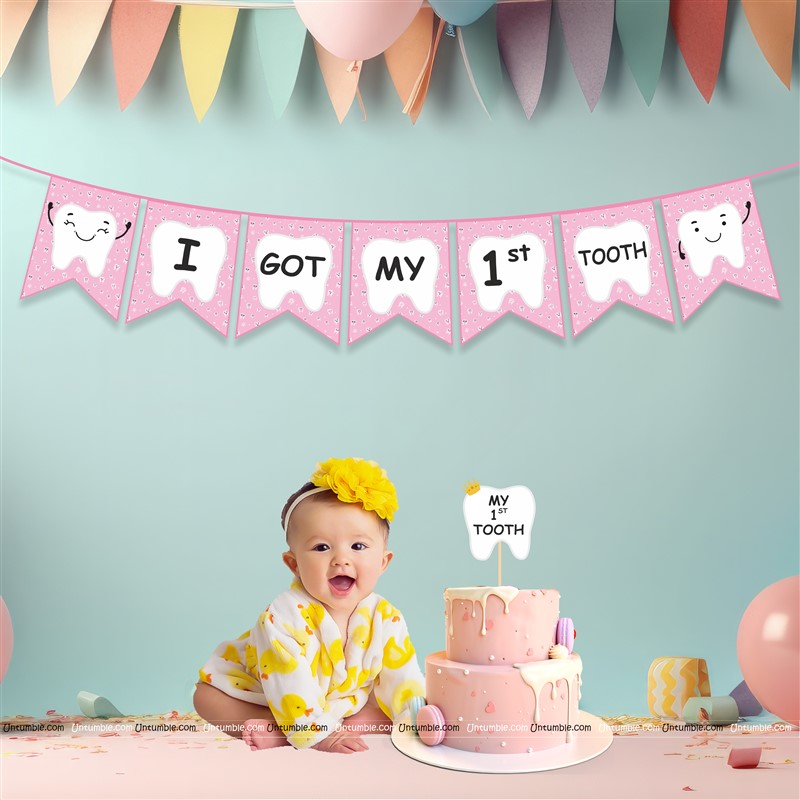 Pink First Tooth Banner, Cake Topper and Poster Kit ( Pack of 4)