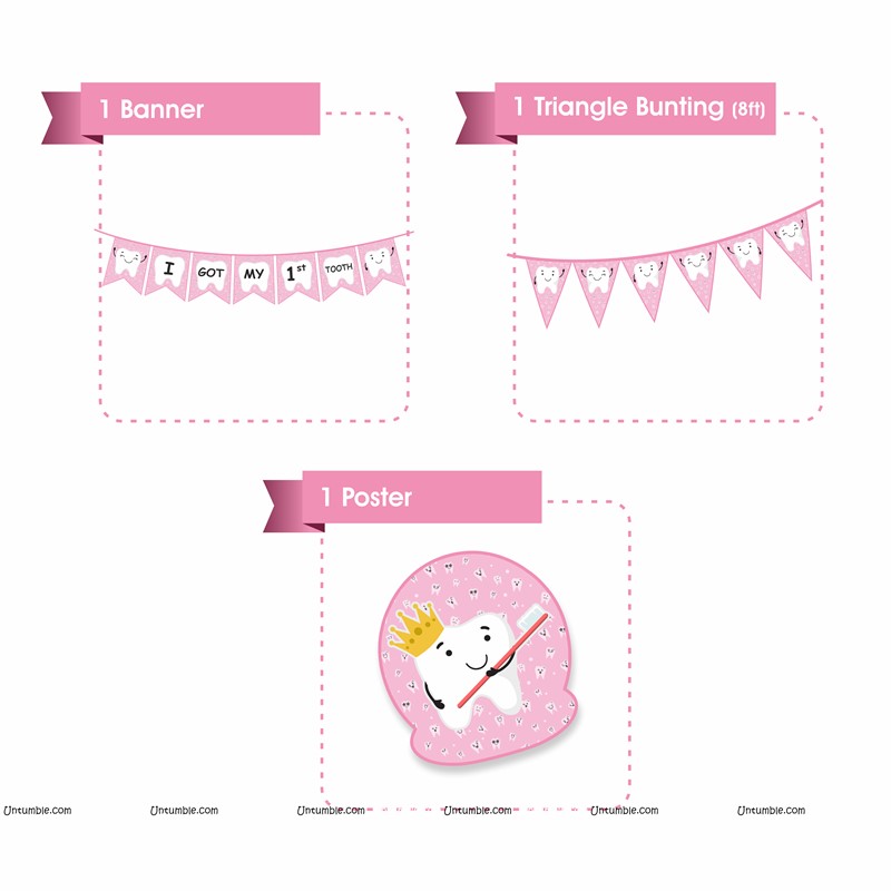 Pink First Tooth Banner, Cake Topper and Poster Kit ( Pack of 4)