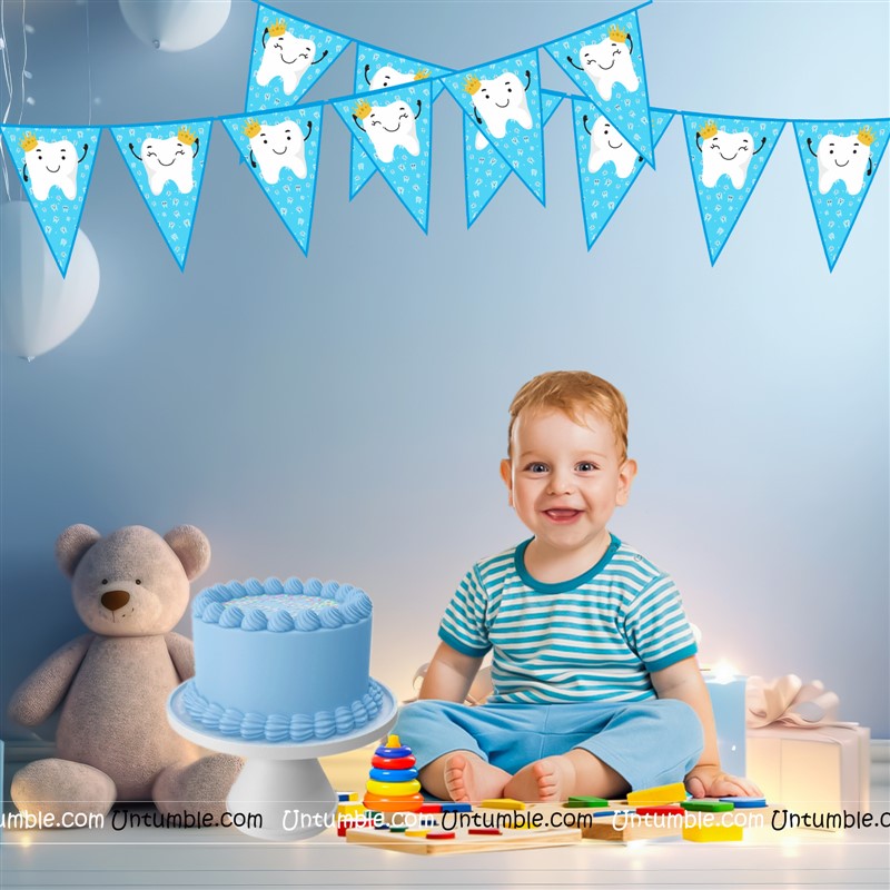 Blue First Tooth Banner and Cake Topper Kit (Pack of 2 Pcs)