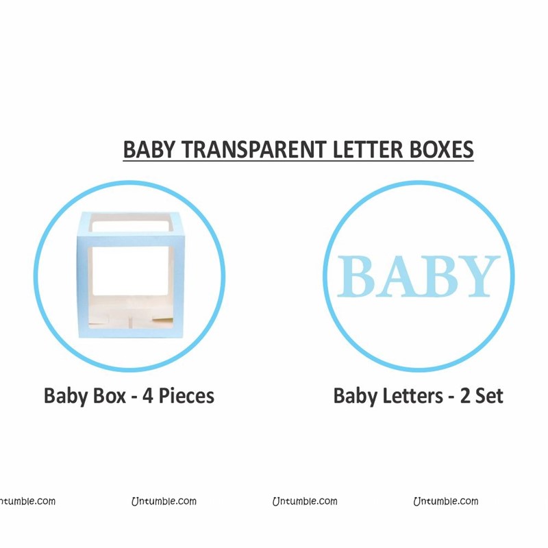 Transparent Letter boxes for balloons. Cube shaped boxes that can hold balloons with some text stuck on the sides. Used for Birthdays & Baby showers. ONE box available in white, blue and pink.