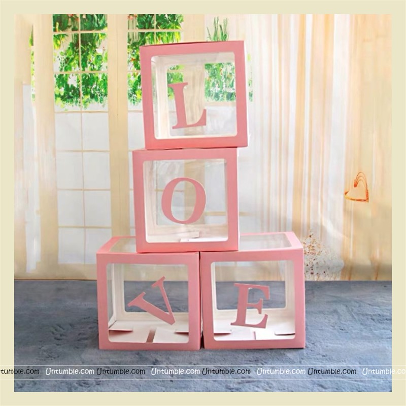 Transparent Letter boxes for balloons. Cube shaped boxes that can hold balloons with some text stuck on the sides. Used for Birthdays & Baby showers. ONE box available in white, blue and pink.
