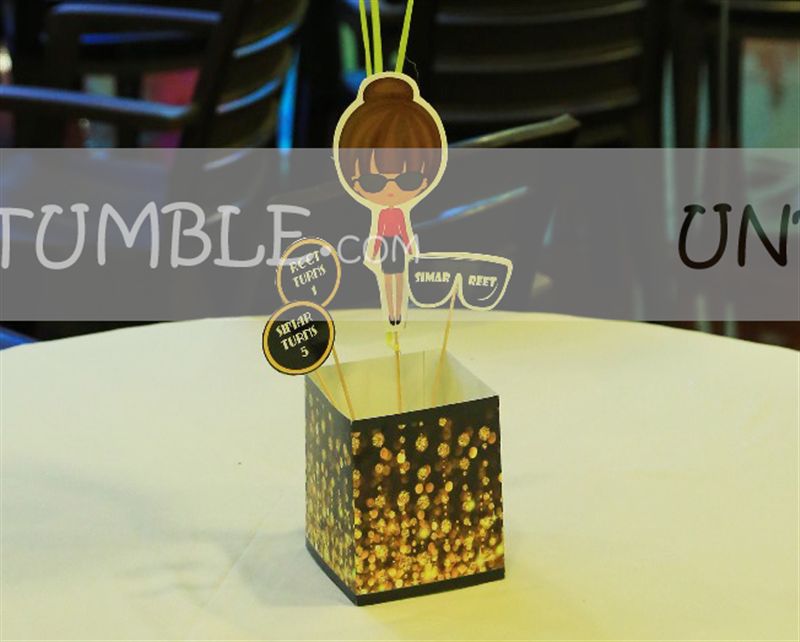 Several different options to pick from - 1. Skewers with toppers poked on a thermocol base or cup cakes2. Sided artboard centerpiece