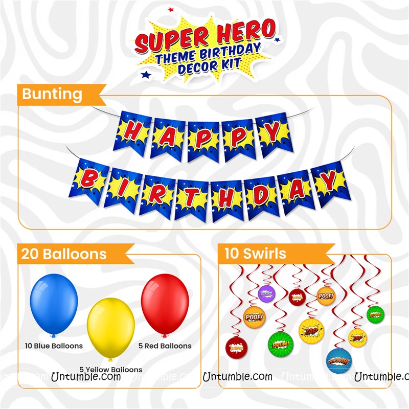 Birthday Decoration kits with Swirls, Banners, Balloons, Posters and more#swrils