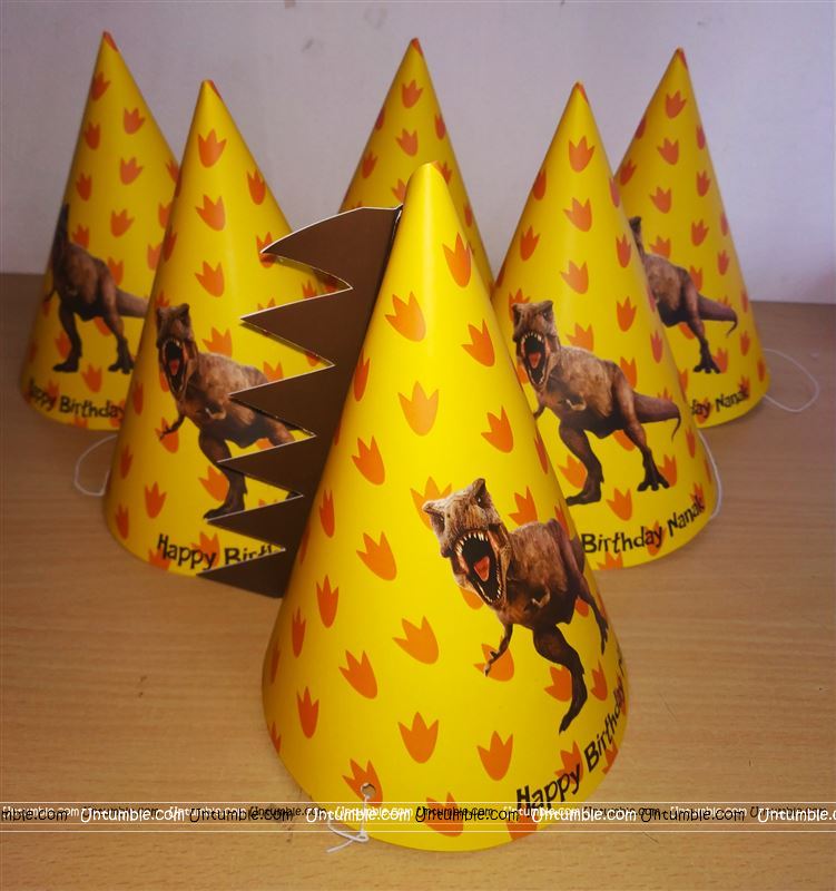 To spread the vibes of the dinosaur theme party, begin with the entrance. Use our best selling dinosaur welcome poster. Decorate either sides of the entrance with our latex or metallic, yellow and green balloons. If you are looking for some printed balloons, then try out our polka dotted balloons. Make your guests feel special with our customized dinosaur party hats. and wrist brands. You can customize it, to your preference.